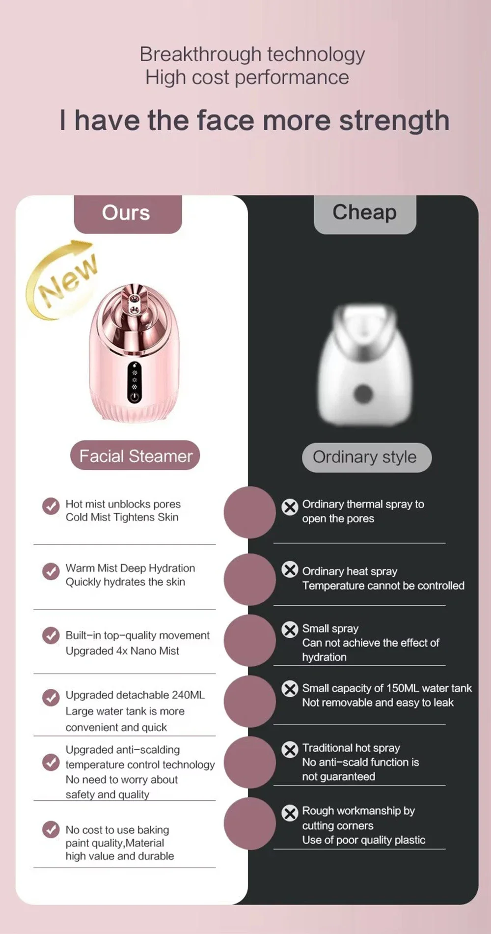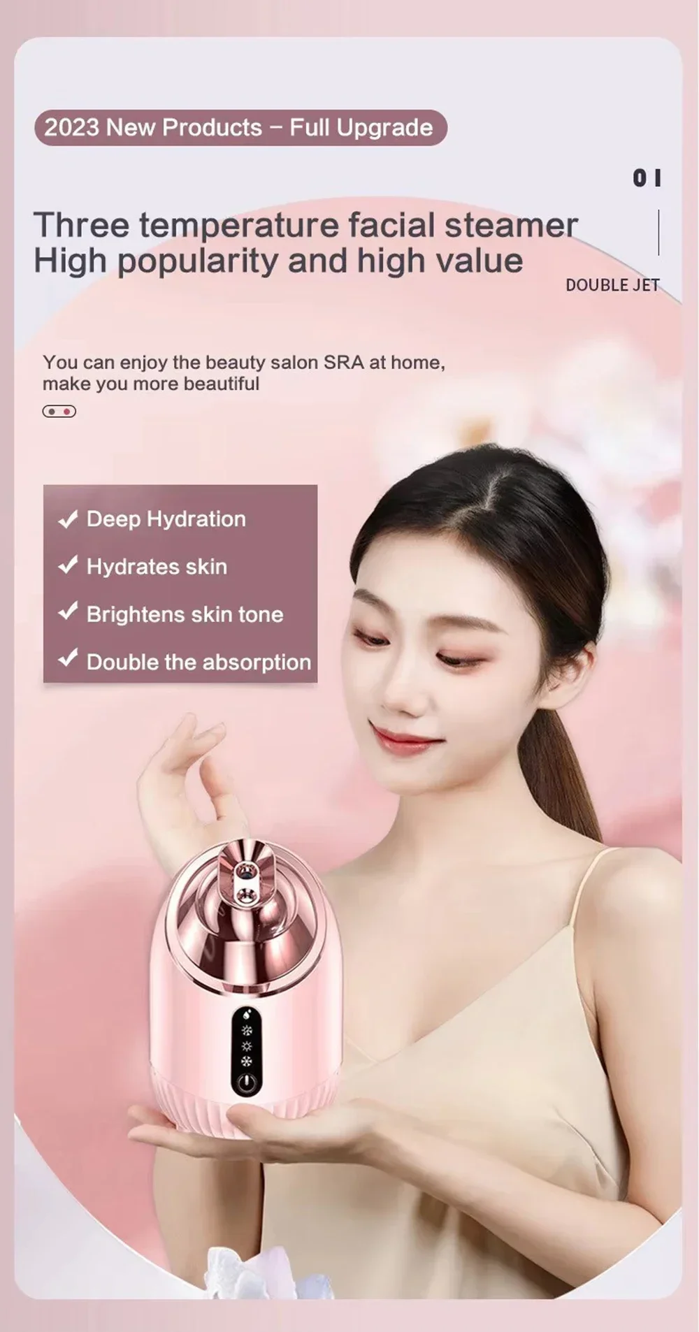 1. Cold & hot & warm 3 temperature mode:Our machines offer 3 modes of cold mist, hot steam and warm steam so you can experience beauty treatments at home. With the combination of warm/hot steam and cold mist, you can achieve skin and pore tightening results. Warm steam opens pores, moisturizes and cleanses the skin, making it an easy way to experience a facial spa at home.