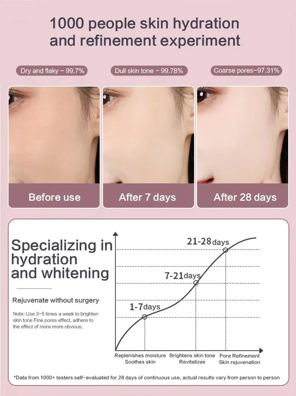 3. It is an excellent companion for facial masks and skin care products. It can promote the skin's absorption of subsequent skin care products, double the nourishment, effectively relieve sensitivity, repair sunburned skin, keep the skin hydrated and plump all day long, and glow with a natural and healthy radiance.