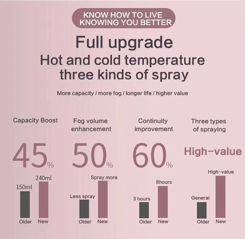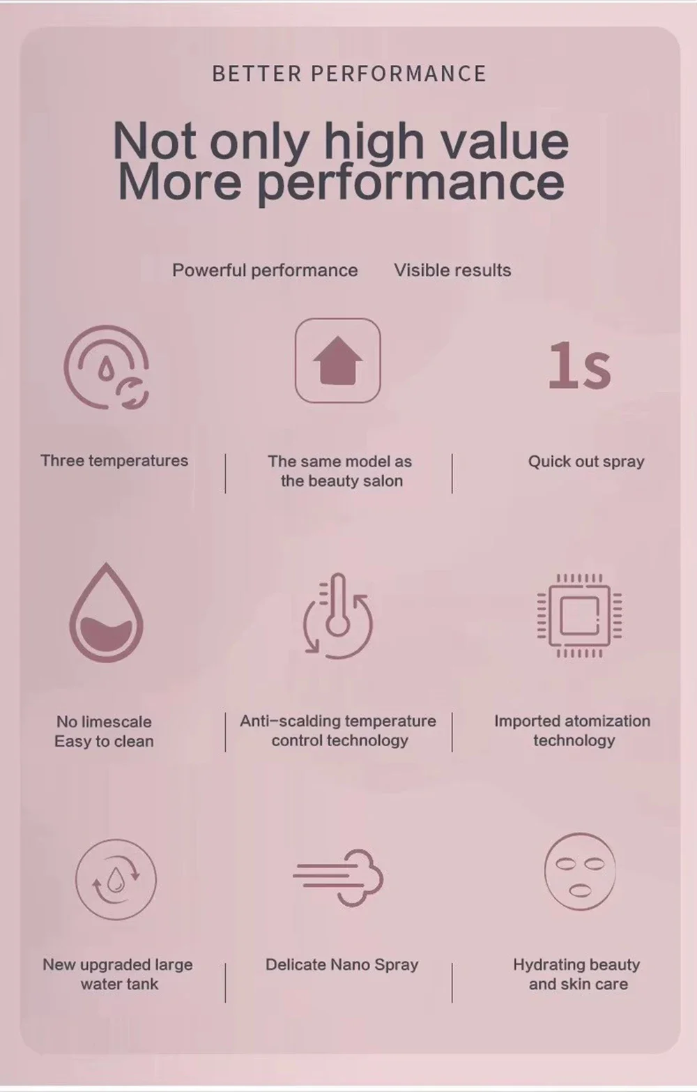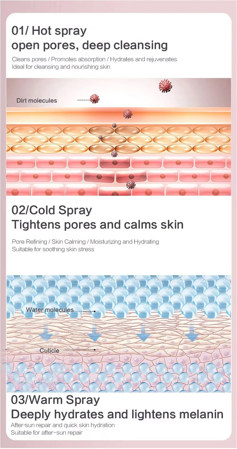 4. Hot spray gently opens the pores and deeply cleans the dirt and oil inside the skin; cold spray helps tighten pores, calm the skin, and bring immediate relief; warm spray deeply hydrates, dilutes melanin, and makes the skin glow with natural radiance.
